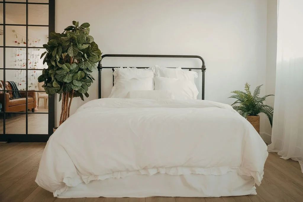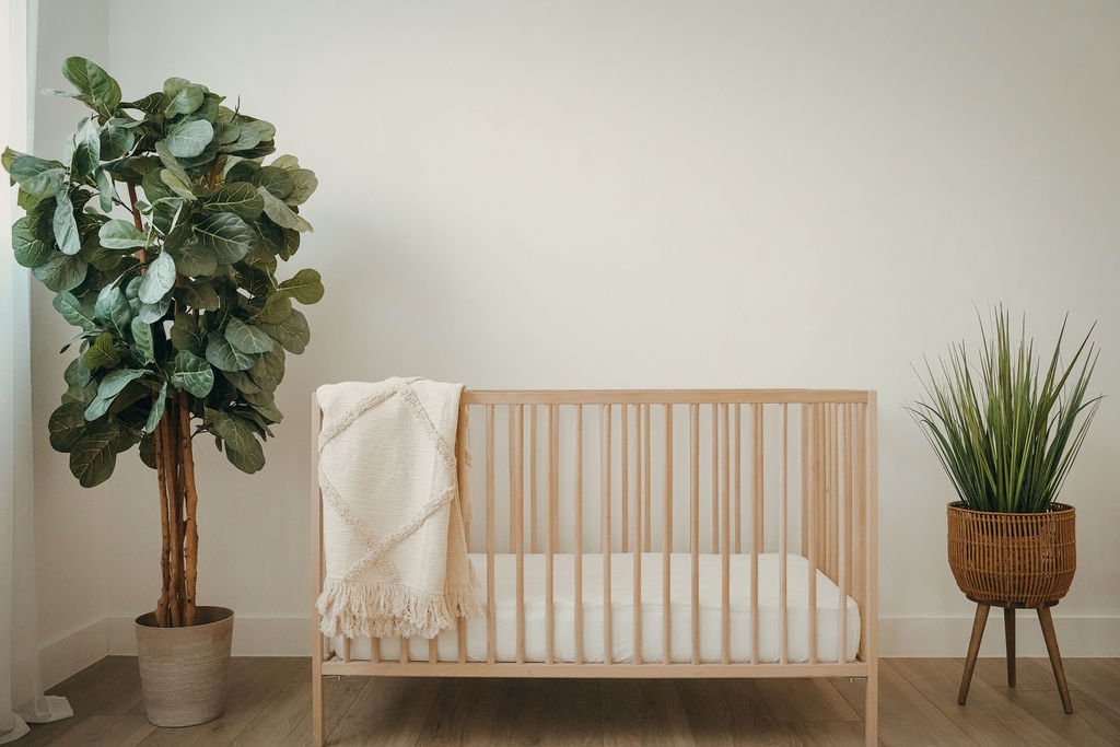 A queen bed, daybed, crib, cradle, and toddler bed—each styled in soft whites and natural wood to create timeless backdrops for every story